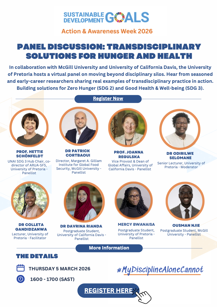We will be highlighting the interdependence between SDGs, zero hunger (SDG2), and good health (SDG3), to demonstrate the role of transdisciplinary approaches in addressing the SDG challenges using examples and experiences from researchers who are applying transdisciplinary approaches in their work. A panel discussion consisting of both experienced researchers and young researchers will reflect on the tools that are available to practice transdisciplinarity and break disciplinary silos. The week will commence with an awareness campaign led by University of Pretoria students. Students, staff, and community members will reflect on the limits of single-discipline solutions, culminating in a panel discussion to contextualise future