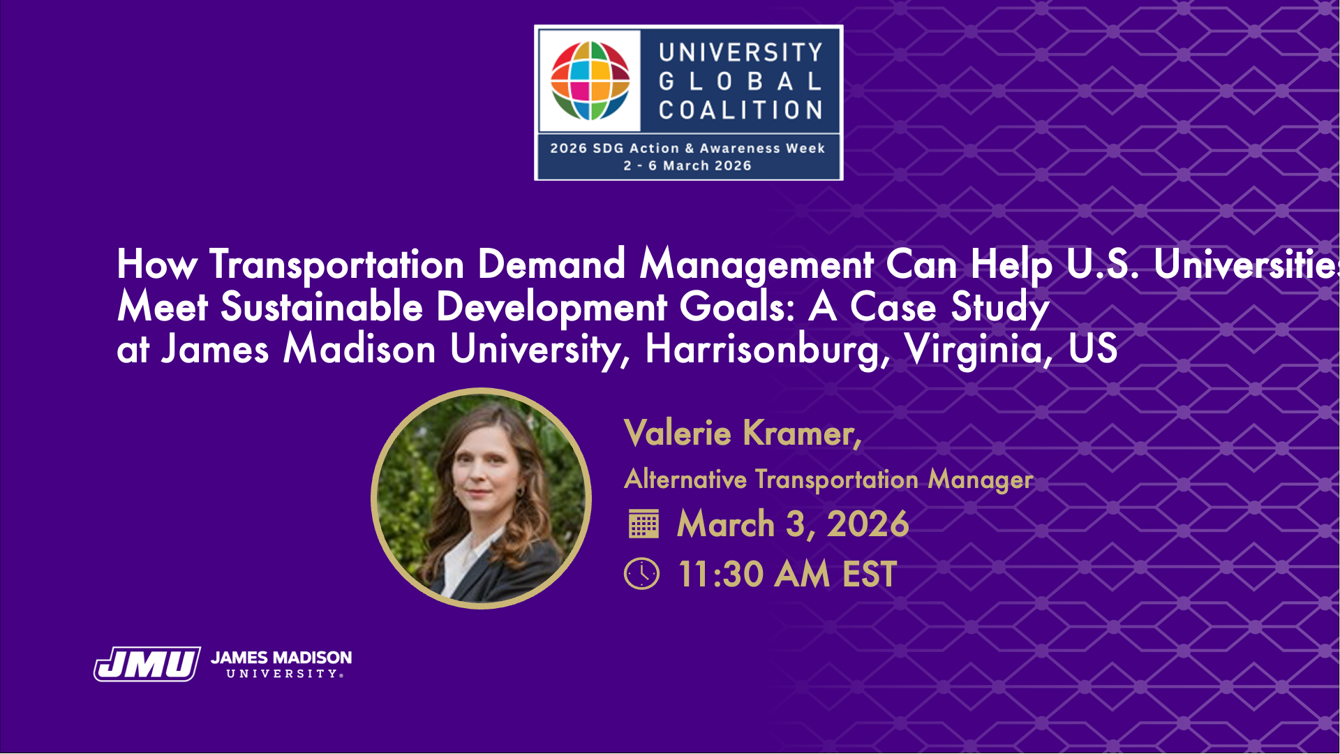 How do you change campus infrastructure, policies, and individual behavior to support a culture of walking, bicycling and taking the bus? Valerie Kramer, JMU Alternative Transportation Manager, will be hosting an Action & Awareness Week virtual program exploring facilitating the shift to sustainable campus transportation.