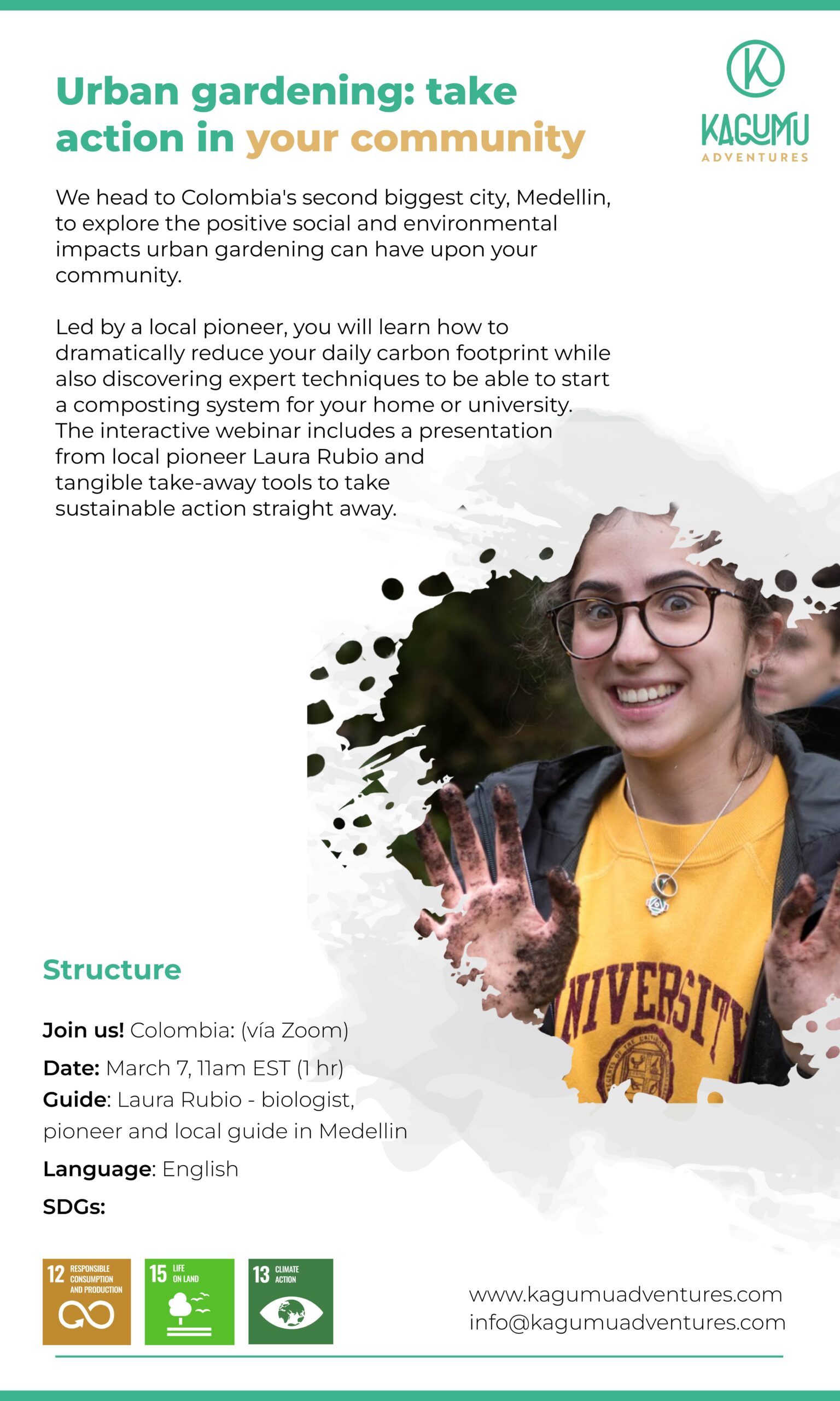 We head over to Colombia’s second biggest city, Medellin, to explore the positive social and environmental impacts urban gardening can have upon your community. Led by a local pioneer, you will learn how to dramatically reduce your daily carbon footprint while also discovering expert techniques to be able to start a composting system for your home or university. The interactive webinar includes a presentation from local pioneer Laura Rubio and tangible take-away tools to take sustainable action straight away.